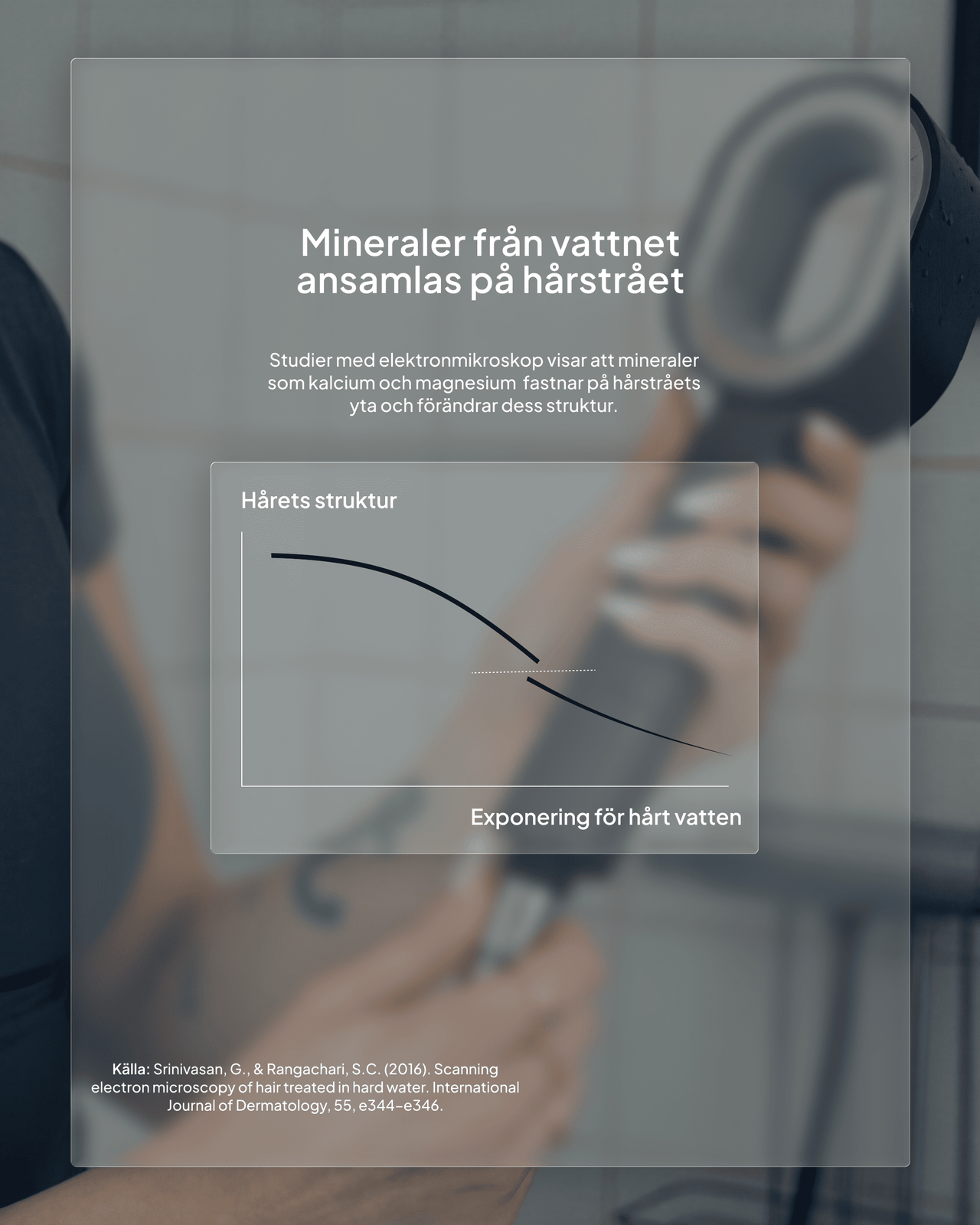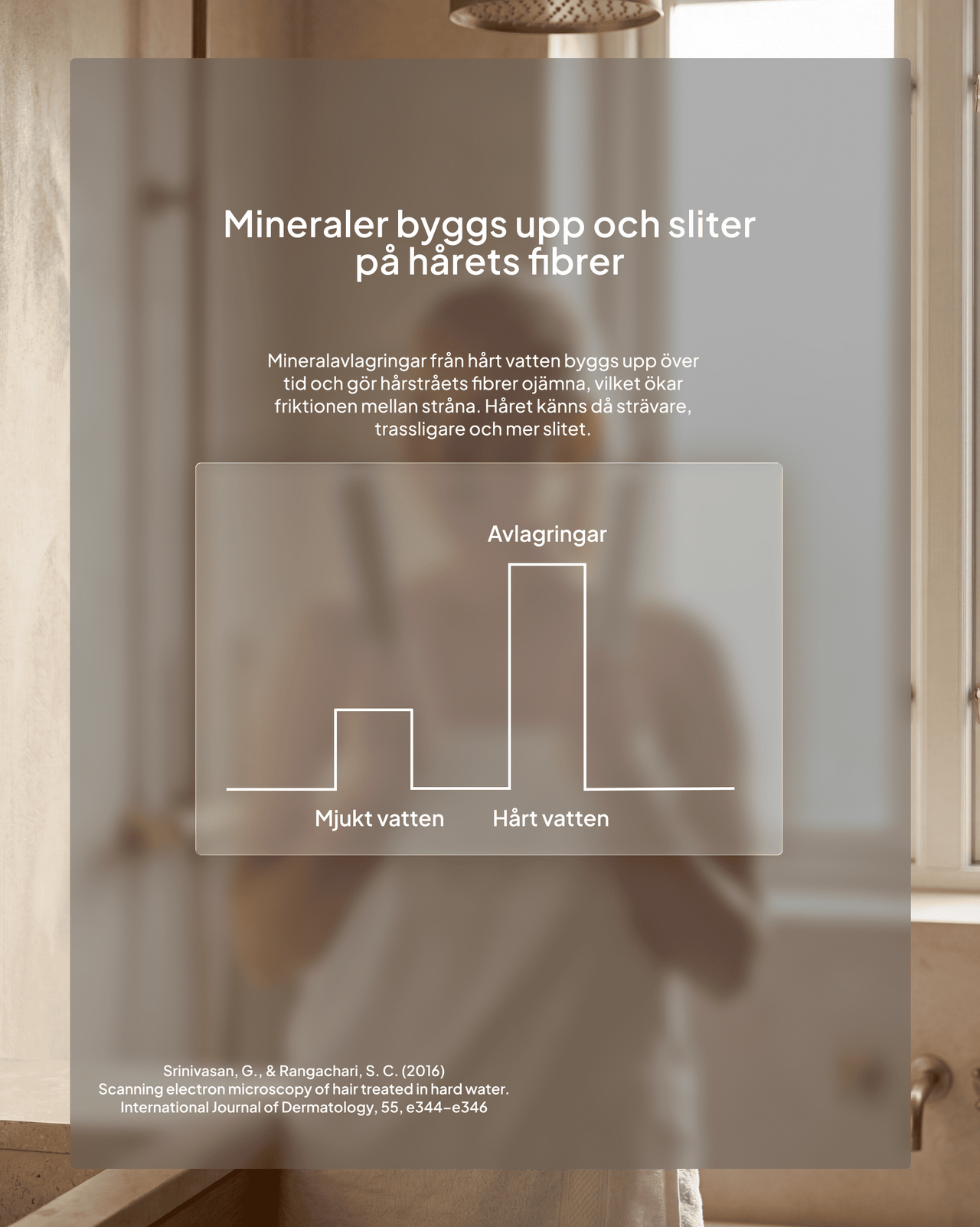 Hårt vatten innehåller höga halter av kalcium och magnesium. När du duschar i varmvatten fastnar dessa mineraler på hårstråets yta. Forskning med elektronmikroskop visar att mineralerna bygger upp ett lager som förändrar och försvagar hårets struktur – håret känns strävare, tappar glans och tar sämre upp balsam.